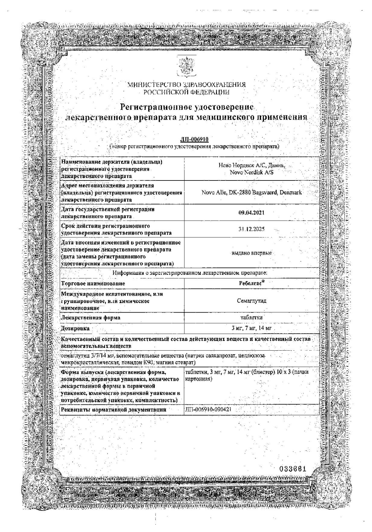 На терапии препаратом "Ребелсас®" 3 мг, 7 мг, 14 мг в течение 26 недель было получено статистически значимое снижение массы тела на 1,4 кг, на 2,4 кг и на 3,7 кг против снижения на 0,4 кг в группе плацебо (р< 0,05, р< 0,001, р< 0,001 соответственно дозе).