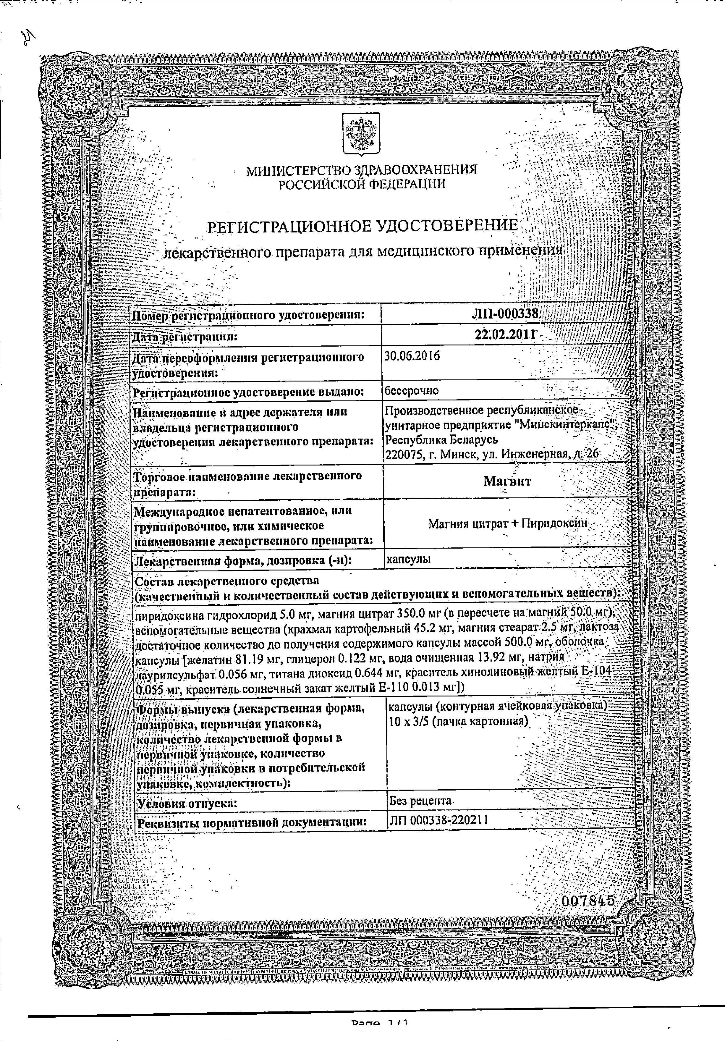 1 таблетка содержит: магния лактата дигидрата 470 мг (48 мг Mg2+), пиридоксина гидрохлорида (витамина В6) 5 мг.