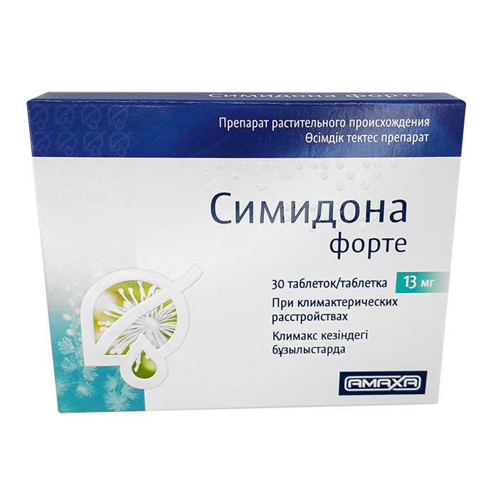 Симидона - лекарственный препарат растительного происхождения, действующим компонентом которого является экстракт цимицифуги. Симидона является фитоэстрогеном и применяется с целью коррекции нарушений здоровья женщин, возникающих в период климакса. Снижает либо полностью устраняет характерные для менопаузы и предменопаузного периода симптомы: улучшает общее самочувствие женщин, способствует устранению недомогания, стабилизирует работу вегетативной нервной системы, предотвращает появление психических расстройств, уменьшает интенсивность "приливов", оказывает успокаивающее действие.